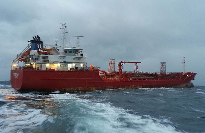 Fra Dalasundet der "Acergy Viking" manøvrerer. Ute i horisonten kan skimtes at det var stor sjø i dag.