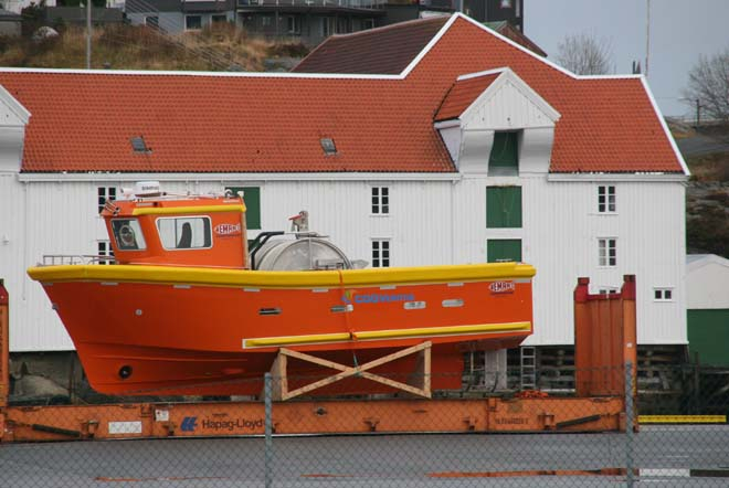 Kristiansundsk: Jemar Norpowerbåt til Frankrike og Norsk Klippfiskmuseum Milnbryggen i bakgrunnen.