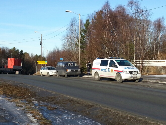 Politiet er på stedet , og trafikken er ikke hindret.Litt skrammel ble det i sammenstøtet, men kjørbare biler etterpå.