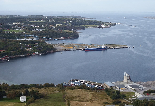 Her utsikt rett nordover mot Røsandbukta, Biowood-kaia og Bremsneslandet lenger ut.