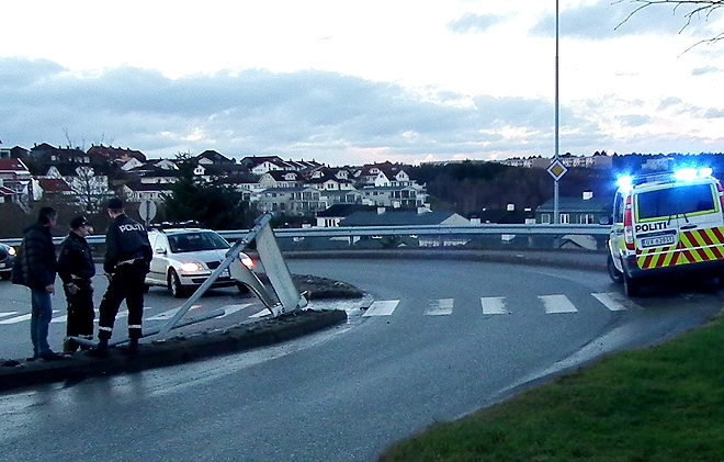 En bil har kjørt ned et skilt ved rundkjøringen ved Statoil Viadukta i ettermiddag.Bilen bare forduftet fra stedet.