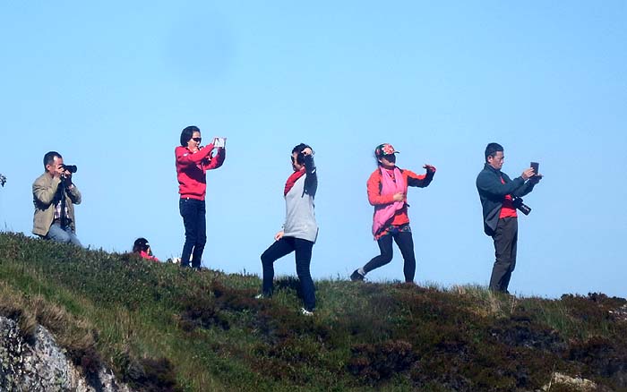 Stadig tilstrømming av turister som vil se Atlanterhavsveien. I morges var det et leven oppe på en aug ved veien da fotografering skulle foregå.Nå er kaféen på Edhusøys åpnet for sesongen også. Her en blid gjeng som var tidlig ute mandag morgen. (Foto:B. O. Angvk) Ellers har Vegvesenet foretatt merking de site dagene.