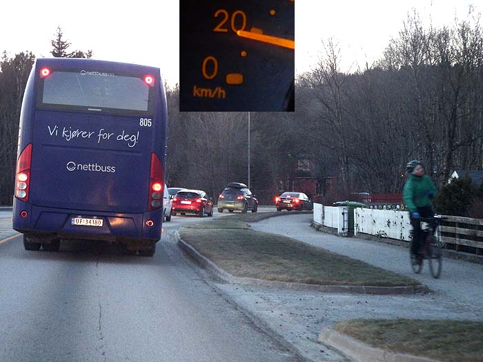Nesten synd på de som kjører buss og skal besørge folk hit og dit. De står som vanlig hver dag i stampe sammen med tusenvis av andre biler på veien inn og ut av byen. Mest ekstreme vi har hørt om er 55 minutter fra Rutebilstasjonen til Futura. Det skal ha vært Nettbuss Timeekspress. Lysreguleringen i Melkvika er et opphopningspunkt. Ble det bedre etter at det lysregulerte krysset forsvant og gangbru ved nettbussverkstedet ble bygd ? Oppe i dette køsystemet kommer brannvesenet og skal ut i en fart. Det er ikke så greit mange ganger.