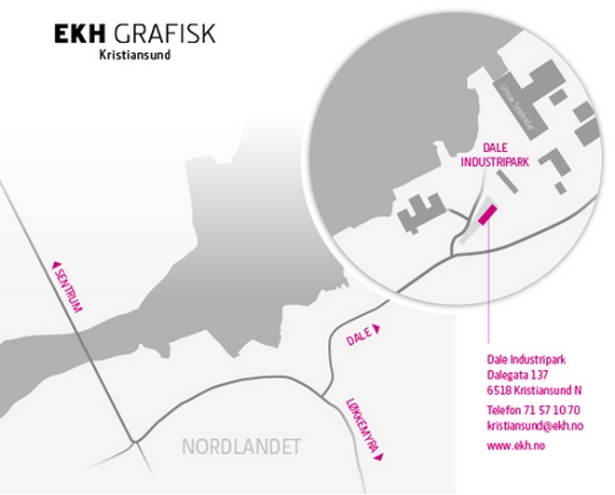 EKH Grafisk Kristiansund har flyttet virksomheten til Dale Industripark i Dalegata 137.Bedriften opplyser at de kommer til trivelige og lyse lokaler med utsikt utover Dalasundet som gir inspirasjon til kreative løsninger på papir og nett. Epost og telefonnummer er som før for vi opplyst.