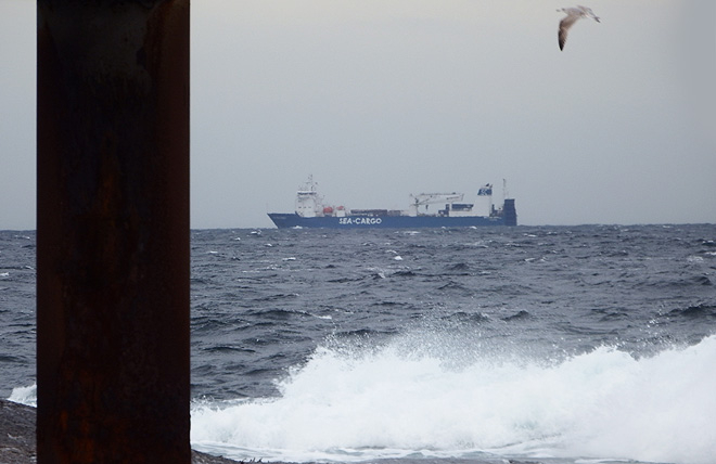 Meteorologene melder : Sør og sørvest frisk bris, fredag ettermiddag auking til sørvest stiv kuling på kysten, om kvelden sterk kuling og periodevis liten storm, først i sør. Regn, snø i høgda. Om kvelden sludd eller haglbyer, utrygt for torever. Her mot havet under bruene på AH veien torsdag formiddag der " Sea Cargo Express" seiler sørover.( Foto: Bjørn Ove Angvik)