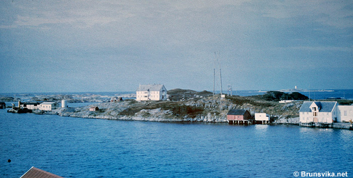 Bilde fra 1970 tallet av holmen før den var tilsådd med Sitkagran. Brygga til høyre strøk med i en brann tidlig på 1980 tallet.