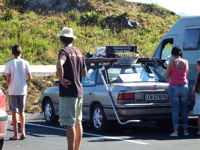 Her er den nå berømmelige bilen ute på Atlanterhavsveien. I verden det rom for litt av hvert. " Krimminelt", er et utrykk på Averøya, men i ordets rette forstand er dette ikke det i det hele tatt.