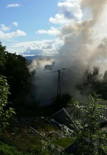 Bilde fra oversiden av husene nå ved 11: 30 tiden. ( Leserbilde Roy mobil) Videosnutt under: Vegard Dahlen.