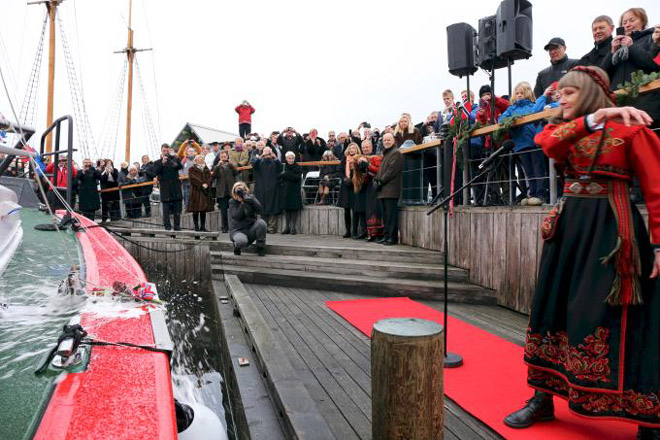 Her døpes nyskøyta for " Bill", oppkalt etter første skipet i rederiet A/S Bill. Dette gikk for seg på Sjøfartsmuseet .( Foto: Redningsselskapet)