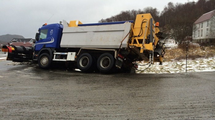 Brd. Bakk ble stående på Bruvolla ved Kverneskrysset med en brøytebil i dag. Litt tidlig i svingen eller noe som ga etter, så er vel dette lett med slike tunge biler. ( Leserbilde)