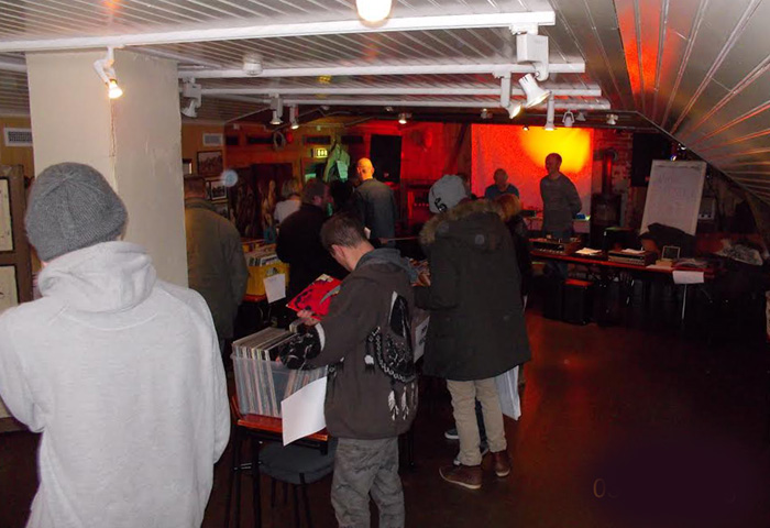 Det var mye folk på ”Vinylmessa” i andreetasjen på Dødeladen. Gamle LP plater og slikt er av stor interesse for mange, og enkelte steder er det egne butikker for slikt. Mye folk og bra utvalg som et par karer fra Averøy hadde tatt med. (Foto: Håkon Bloch)