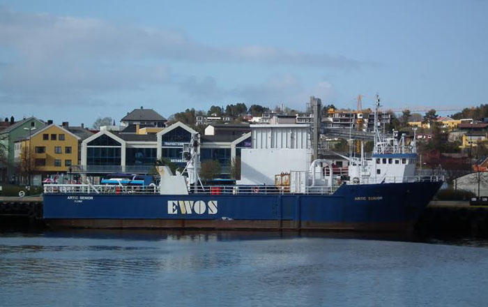 M/S Artic Senior, 48 x 12 x 4 m., bygd I 1982, Florø som hjemmehavn og Norsk flagg. Rederiet er Artic Shipping A/S, Cargo ship som frakter fiskefor for EWOS A/S, Har tidligere hett M/S Terningen 2 og M/S Sanco Captain. Den ligger på gamle ”Nordmørsakaia”.( Foto/tekst: Håkon Bloch)
