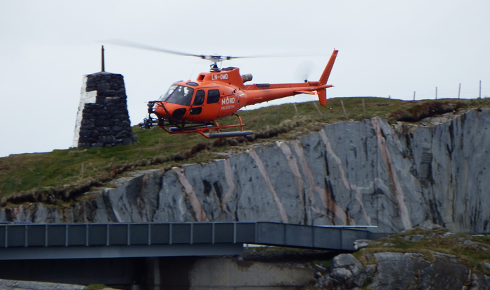 Her helikoteret over Storseisundbrua. Dette helifirmaet har vært her en rekke gangerfor slike ganger. Mest sannsynlig er dette en Range Rover av noe slag. ( Foto: Bjørn Ove Angvik)
