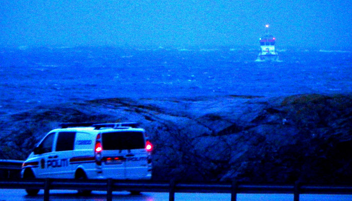 Det er hovedredningssentralen i Sør-Norge som koordinerer søket får vi opplyst. Her " Erik Bye" og politiet på / ved Atlanterhavsveien ved 03 tiden. ( Foto: B. O. Angvik)