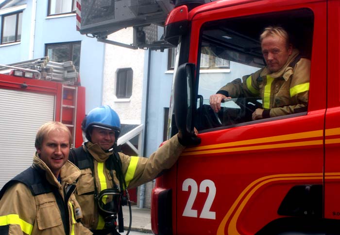 Roger Svanemsli (t.h. i bilen) har vunnet fram i rettsaken mot han på brannstasjonen. T.v Kåre Olav Andersen og Trond Sæther som nå meget mulig kan få arbeide sammen med kollegaen igjen. ( Foto: Brunsvikanet/ Arkiv)