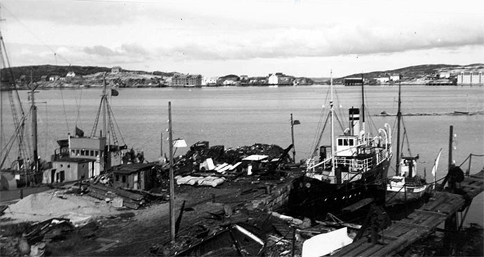 1941 og tysk forpostbåt og en Mørebåt. Tyskerne var oftye innom Storvik for reperasjoner.( Foto. Krigsbilder.net)