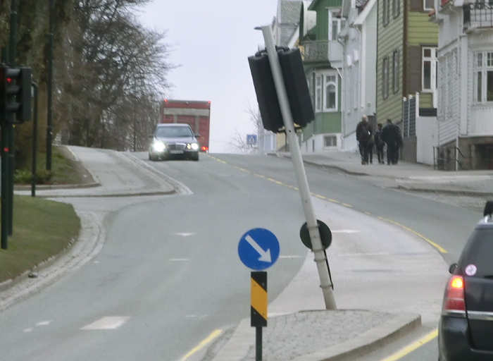 Trafikklyset til høyre er nedkjørt. Politiet oppretter sak. ( Arkiv BN)