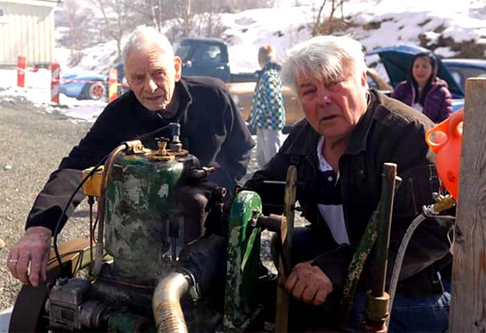 Mannfolk og motor:Her en gammel FM bensinmotor som går som en klokke. F.v. Arne Eldhusøy og Einar Rangøy. ( Foto: Velforeningen)