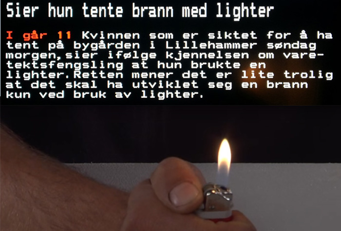 Litt av en naiv rett som skulle varetektsfengsle kvinnen som hadde tent på en bygård i Lillehammer forleden. Om det er NRK feil eller annen teithet vites ikke, men en lighter kan egentlig ødelegge hele verden hvis det kniper om. Utrolig å servere på tekst TV !