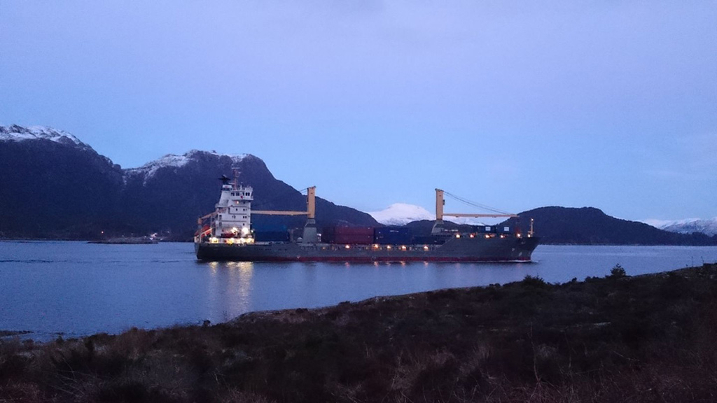 Kontainerskip " Ark" kom tl basen på Averøya / Kristvika onsdag kveld. ( Foto: Gunn Henden)
