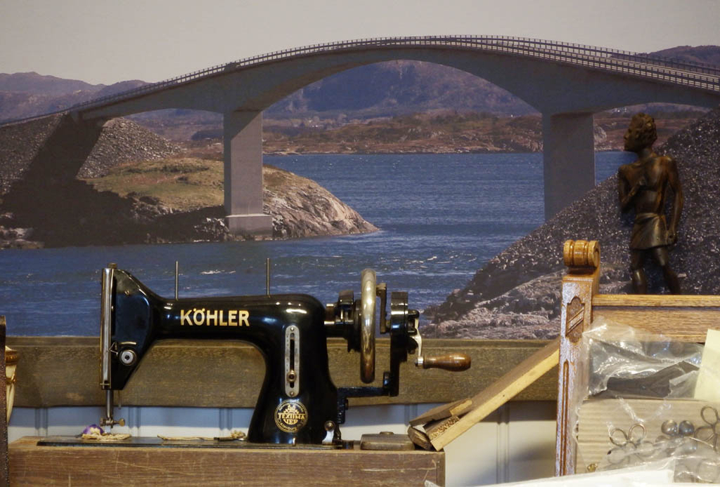 Symaskin " Köhler" som på tysk betyr sei . Tilfeldig plassert ved et bilde av Storseisundbrua på Atlanterhavsveien. ( BN)