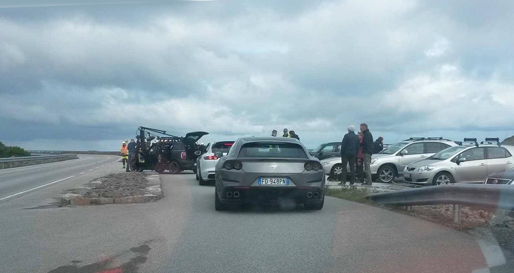 Porsche Panamera Turbo og like svær om ikke råere Ferrari oppover brua. Det luktet nafta og metanol av eksosen. Helt rå akselrasjon. ( Foto: B.O. Angvik)