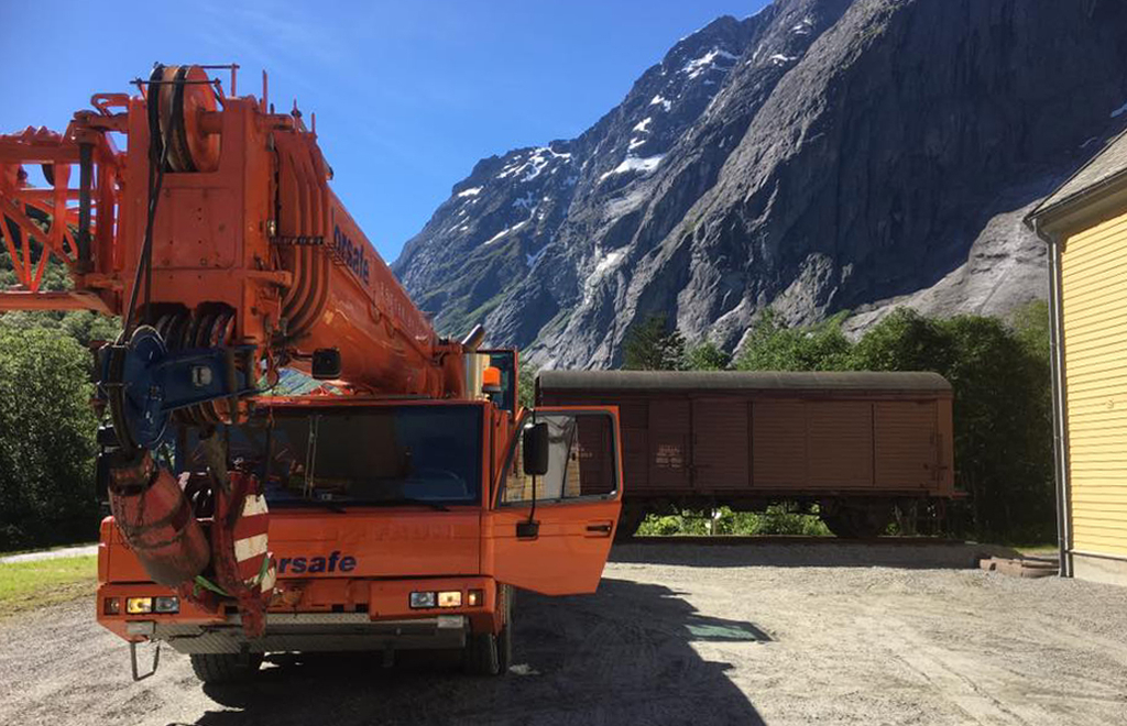 Her ved Trollveggen i Romsdalen er den berømmelige vogna reddet for ettertiden. Etter hvert vil det bli bli laget betydelig informasjon her om denne Gulltransporten som kom med tog fra Lillehammer. Vogna ble fraktet hit med semitrailer og Elementpartner -kran fikk løftet den på plass. ( Foto: Oddgeir Skjevling) GULLTRANSPORTEN 1940