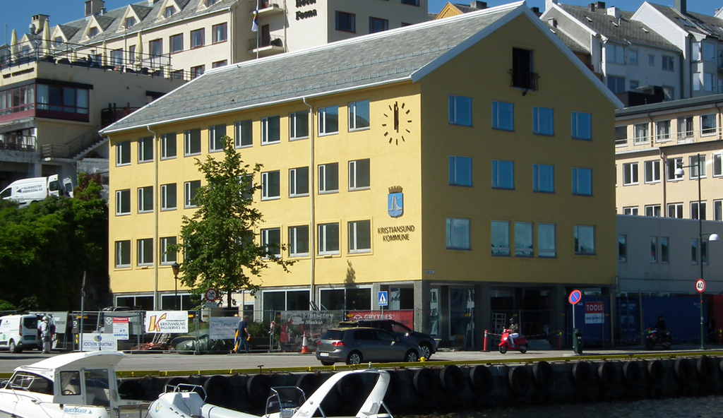 Da er kommunevåpnet til Kristiansund kommet på veggen av Jonasbygget . Det er laget og montert av treskjærer Rolf Sogge. Han dekorerte også Amfi-senteret Storkaia brygge i 2004.