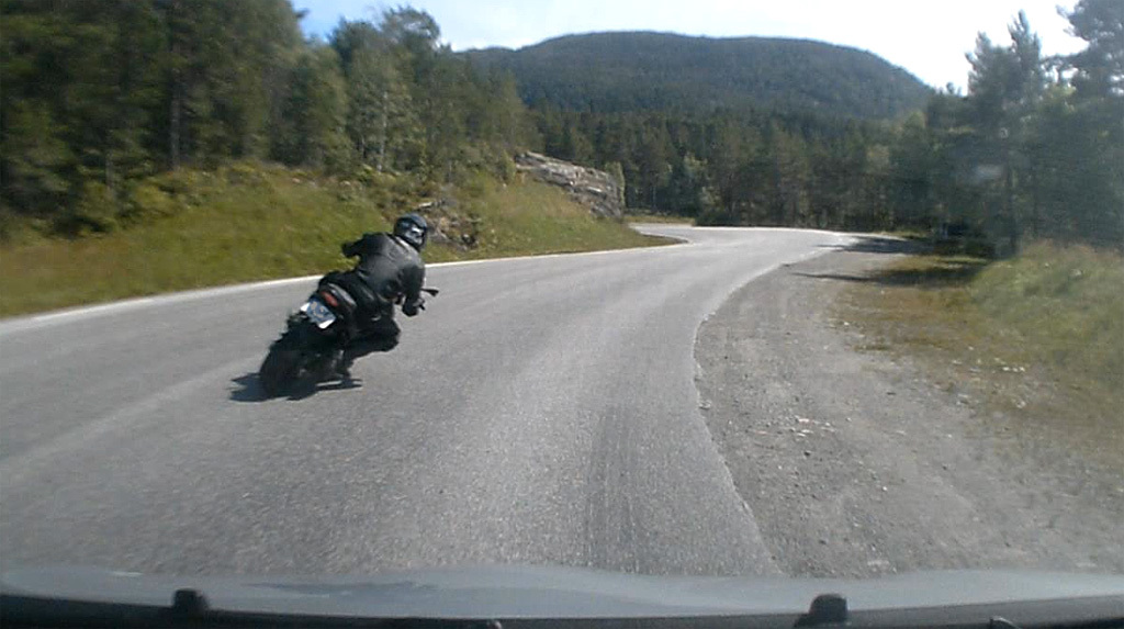 Noen har det veldig travelt på veiene uansett. Selv i svinger. ( BN Dashcam)