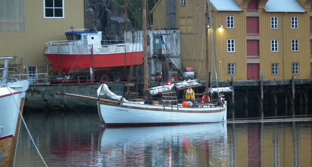 En seiler med navnet " Nordsjø" siger inn i Vågen etter lang ferd fra Bodø. Nå¨ble det kuling på Nordmøre og skikkelig sommeruvær mandag. ( Foto: Håkon Bloch)