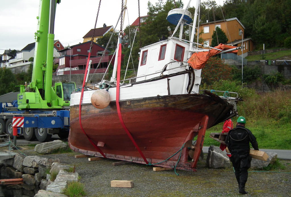 Her er båten heist opp på løand onsdag. ( Foto: Håkon Bloch)
