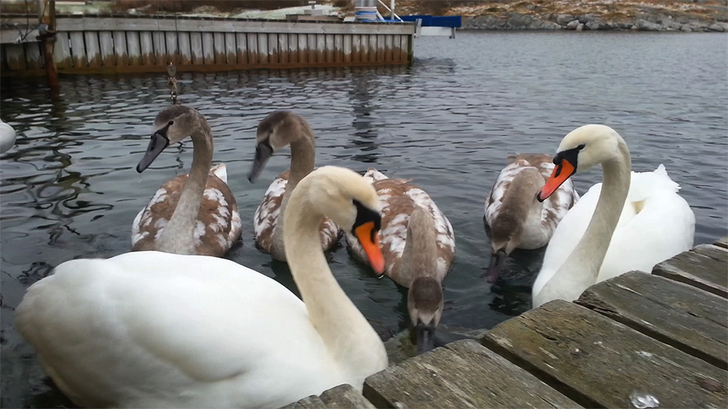 I Brunsvika holder et svanepar til med hele 4 unger. De er sikkert sultne, for hver gang noen nærmer seg sjøen kommer de svømmende. Noe særlig mat er ikke å finne nå. De spiser vanligvis planter og gress, og det heller lite av nå . Før ble de fóret med brød, men det er visst ikke bra. At noen store slike fugler har krepert av noen skalker har vi dog aldri sett.