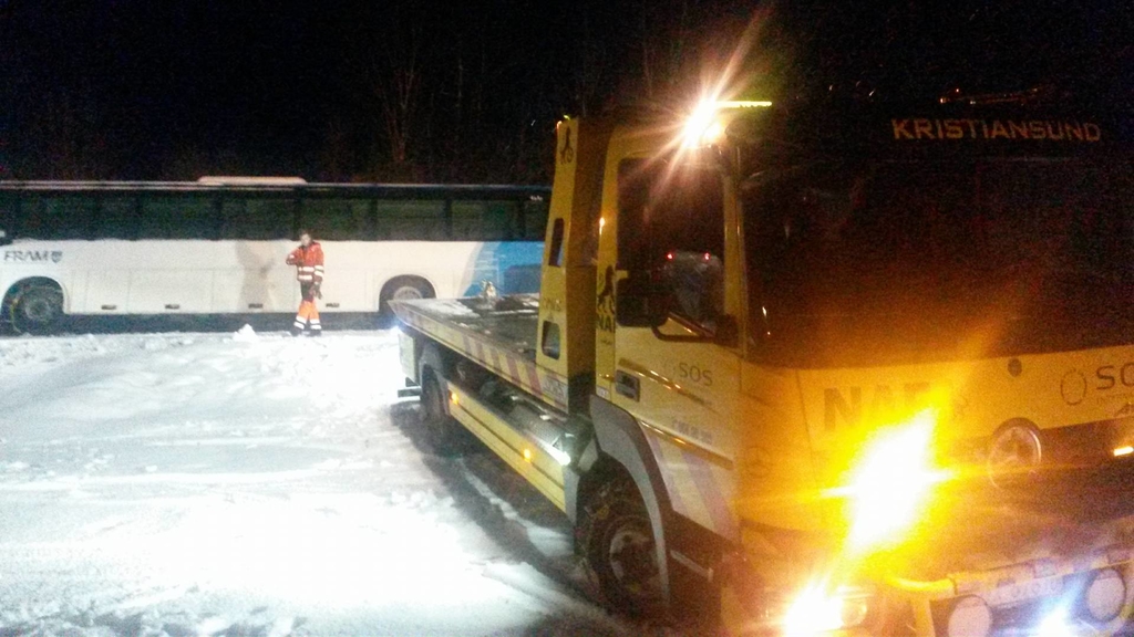 NAF bergningsbil skal forsøke å få bussen på veien. ( Foto: Magnar Heggeset)
