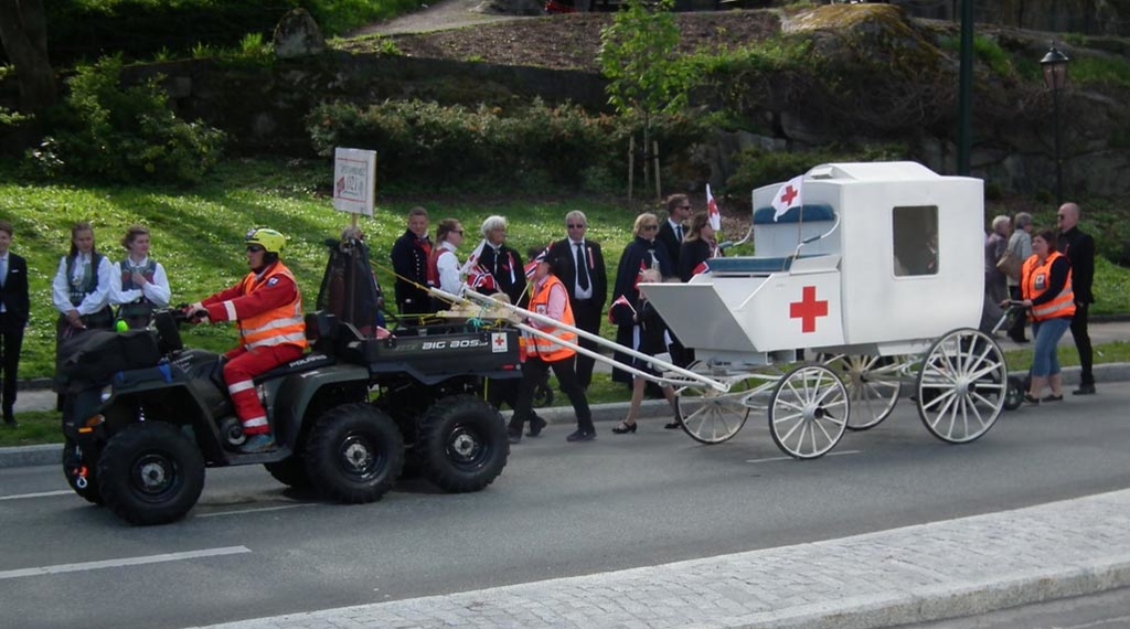 Fra Kristiansund: I toget hadde Røde Kors med seg den gamle sykevognen som har vært mange steder før den kom tilbake og ble resturert av portørene på Sykehuset. Den ble innkjøpt som gave til Sykehuset av Kristiansund Krets av Norges Røde Kors i 1921, den kostet da 3700 kr. og hadde gummihjul spesielt beregnet for byens bakkede gater. Den var laget av Sørensens Vognfabrikk i Oslo. Denne tiden hadde sykehuset to sykevogner, denne hvite og en “Grønn en” som ble brukt smitsomme sykdommer som pest (Spanskesyka) og når den ble brukt holdt folk seg innendørs. ( Tekst/ foto : Håkon Bloch)