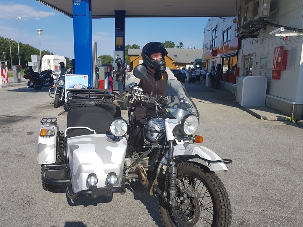 Her var litt av en tøffing å se på bensinstasjonen XY ved Atlanterhavsveien. En kar med cerebral parese som er på tur med en russisk Ural MC med sidevogn. Andreas het karen og var fra Trondheim og skulle kjøre Vestlansdkysten til Bergen over til Østlandet og heim til Trøndelag.