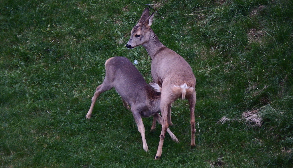 To rådyr ruslet stille og rolig i hagen til Måseveien borettslag i dag og plukket rognebær som hadde falt ned fra trærne der. Da har altså sidensvansen konkurranse, men rådyrene klatrer ikke i trær da.