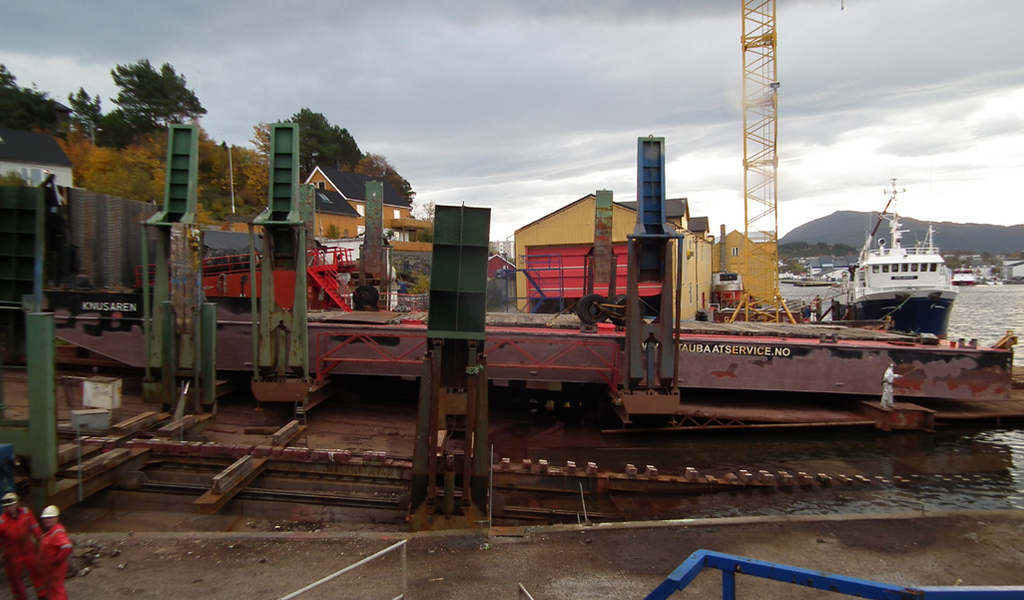 Kristiansund Taubåtservice A/S sin lekter “Knusaren”, 40 x 12 m. står på slippen til Kristiansund Mekaniske Verksted A/S, (Mollan). Det er en arbeidslekter med 2 x hydraulic ankervinsjer og 2 x hydraulic capstaner. Navnet har den etter at da Statens vegvesen eide den, var det montert et steinkuseverk ombod. Mye brukt i forndelse med fergekaibygging. (tekst/foto Håkon Bloch)