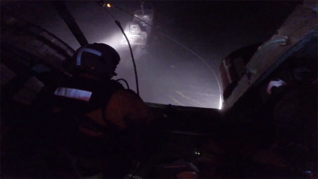 En svært krevende redningsoperasjon foregikk i 24 minus og sterk vind og hav. 14 mann ble berget. ( Foto: Heli Sysselmannen på Svalbard)
