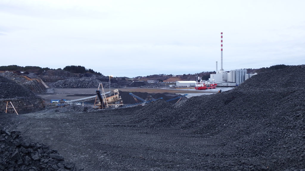 Rett før helga var den nederlandske steinleggeren " Flintstone" inne for å laste opp stein. Skipingen skulle i havet 200 km nord for Kristiansund på et felt der. Det er Gunnar Holt A/S som driver dette steinbruddet her. ( Foto: Boa/BN)