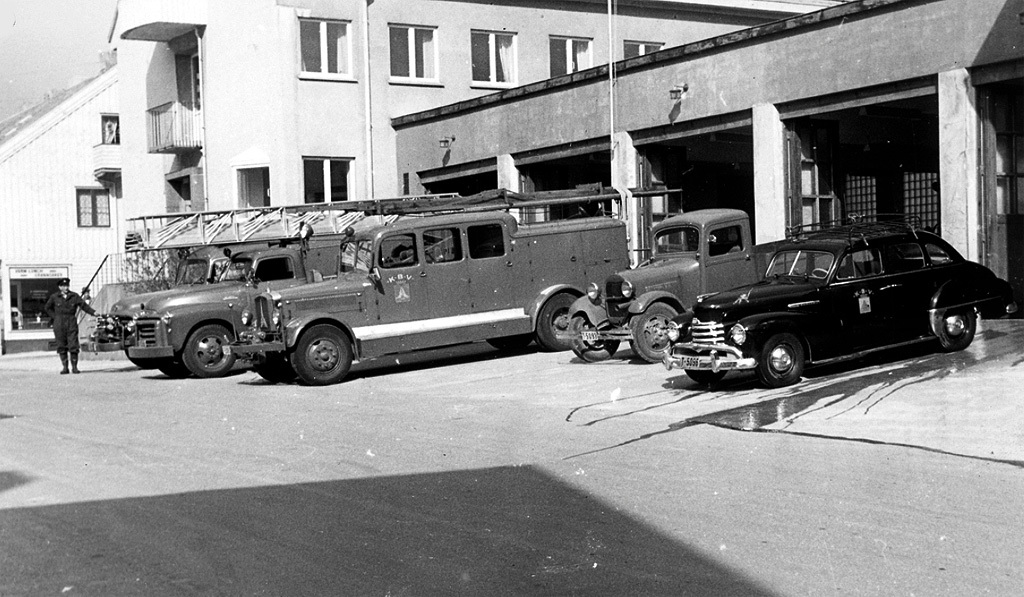 Nå skal visst brannstasjonen flyttes ut av sentrum i Kristiansund . Her et bilde fra 1957 da stasjonen var ganske ny. Den var tegnet i 1944, men ble ikke tatt i bruk før i 1950. Den gang var den svært moderne. I 2003-2004 ble det investert i nye rom der alle fikk egen dusj og ellers oppgradering. På bildet bilparken den gang. ( Foto: Nordmøre museum)