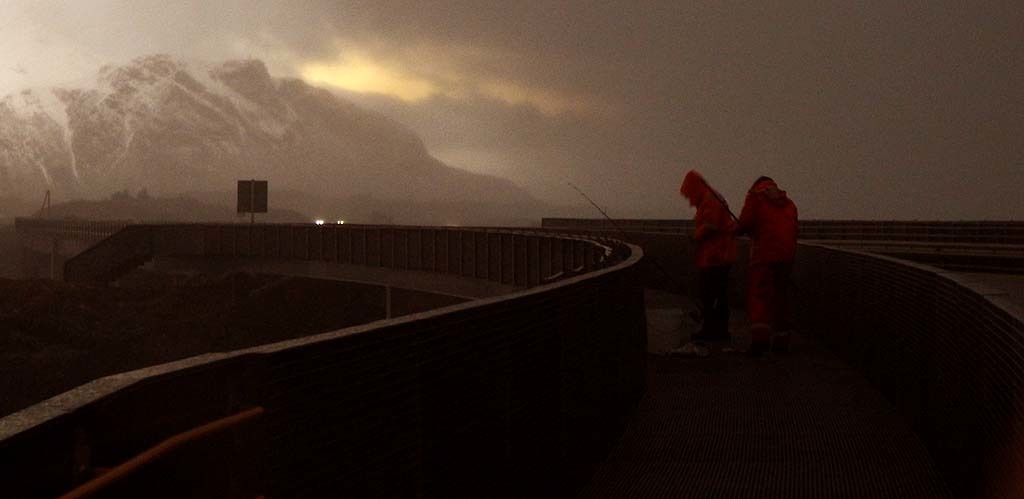Det er faktisk noen som trosser vinter og haglbyger og prøver stanga på fiskebruene i Hustadvika kommune på AH veien som det nå heter. Men det er skralt og ikke noe å få på denne tiden. Fisken står dypere. Under bruene er det bare 11-12 meters dyp.