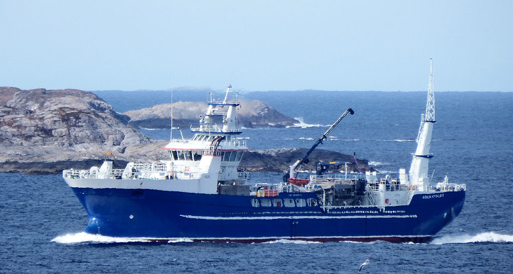 Her kom en fiskfrakter forbi Øksenvågen som trolig ikke har vært innom før. «Aqua Kvaløy» er den andre av to båter som blir levert fra Crist Verftet i Polen til Dess Aquaculture. Båten har en kapasitet på 3000 m3. Fremdriften for brønnbåten sørges for med 4x Cummings diesel-elektrisk fremdrift med 1040 kwh hver. Mannskapet kan glede seg over at den er bygget med 10 enkeltpersons-lugarer.(Foto: Boa/BN)
