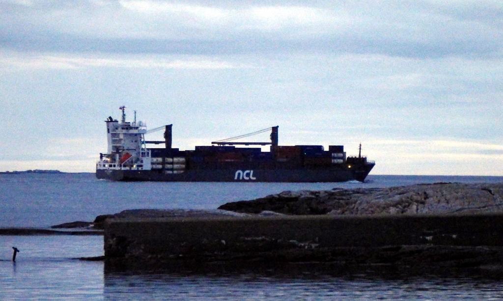 Her kommer et stort skip forbi klokken 23. 30 med det eksotiske navnet " NCL Averøy" ! Det må være det største skipet som har hatt navn med Averøy. Portugalregistert som skal til Høgset eller Averøy. Skipet er 134 m langt og 11206 tonn står det i AIS.