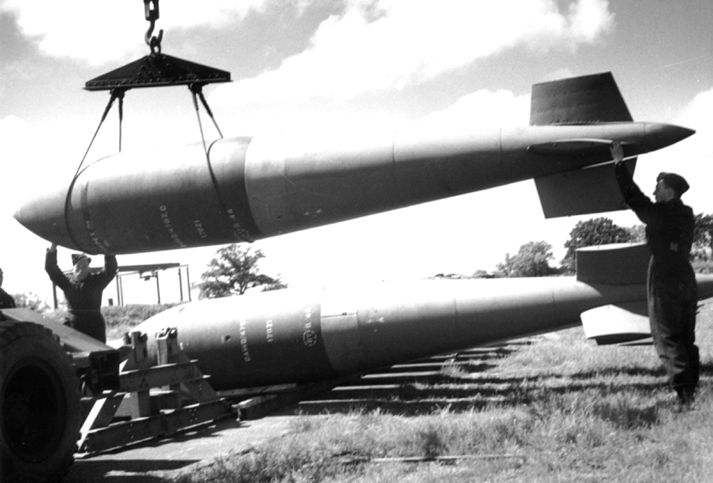 Her er bombene som senket slagskipet " Tirpitz" 12 , november 1944 .Skipet ble truffet at to slike 5400 kilos Tallboy-bomber bragt i luftrommet over farvannet ved Tromsø. Flere traff så nært at havet forsvant rundt skipet og det veltet. Flyene kom fra England, men tidligere hadde også det vært angrep mot skipet fra russiske flyplasser med engelsk flyutstyr der en slik skadet skipet. Også dvergubåter med sprengstoff var benyttet ved en anledning. Til sammen 1066 marinefolk på slagskipet omkom under bombeoperasjonene.( Foto: Ukjent)