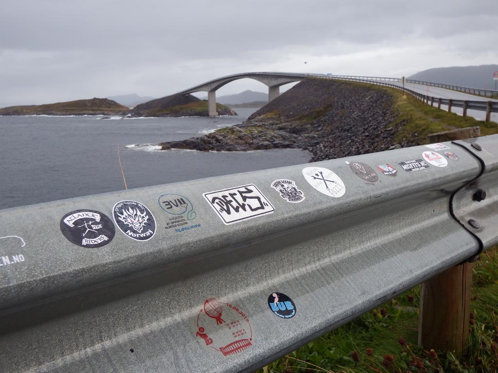I fjor tok Statens vegvesen vekk hundrevis klistremerker fra all verdens land på autovernet på holmen ved fiskebruene her på Atlanterhavsveien. I 2020 har klubber og foreninger som har slike merker satt opp sine bumerker . Slik er det bare, og vil vel fortsette går vi ut fra. ( Foto: Boa/BN)