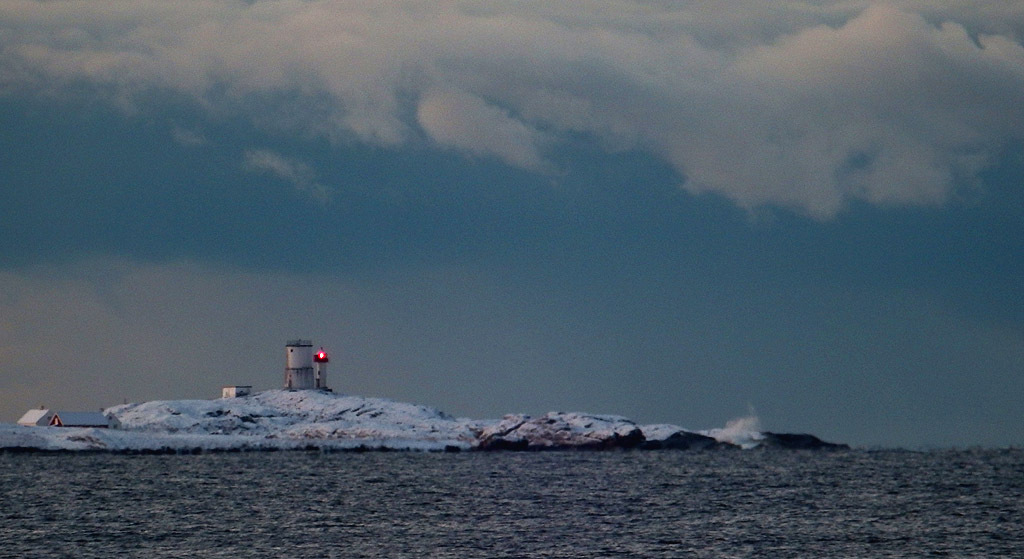 Her Kvitholmen fyrstasjon søndag 1. advent. Snø på holmer til havs også. Nå kommer det påfyll. ( BN)
