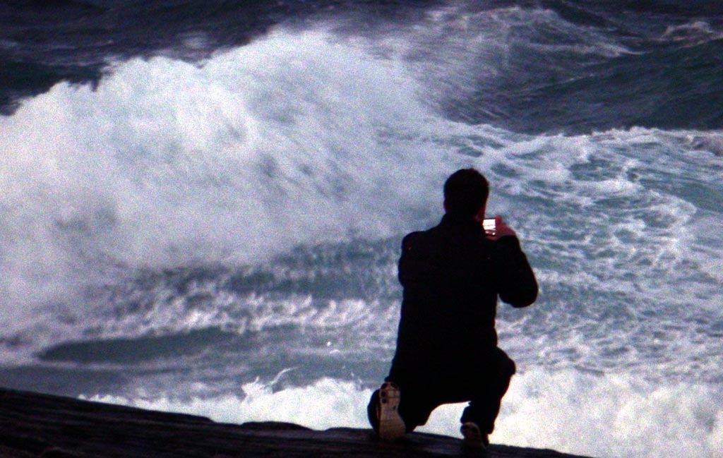 Sent ettermiddag utmed havet. Mann med mobilen sin utmed Skarvøya i Hustadvika.