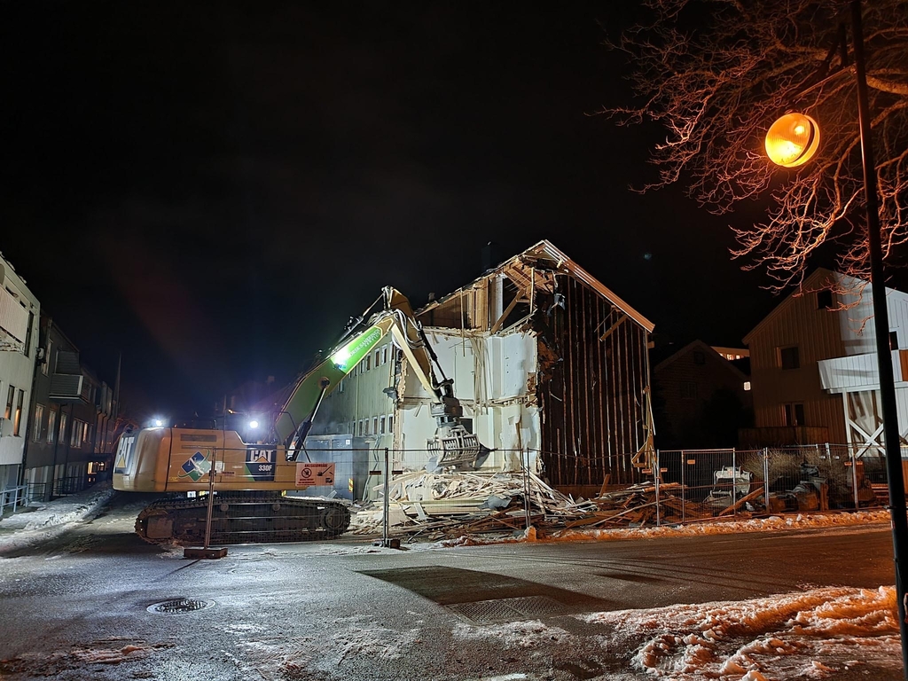Endel husrekker rives i disse dager i Selmersgate nær sentrum i Kristiansund. Trolig er disse hus bygd rett etter krigen uten at vi kan verifisere dette. Nå skal det komme nye hus her etter hvert. Husene eies av kommunen .( Foto: Tor Aage Dyrseth Zdrinka)