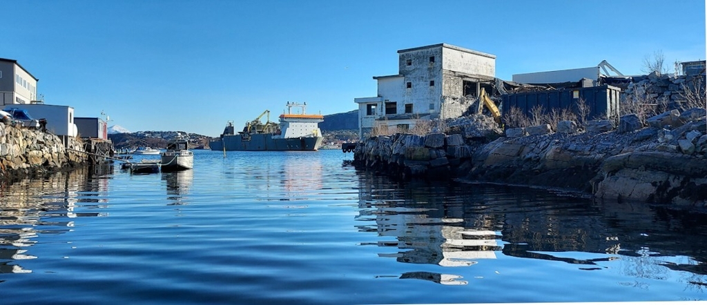 I dag er steinleggerskipet " Rockpiper" inne på Dalasundet i Kristiansund. Den er 158 m lang og bygd i 2012. Det er et spesialverktøy for å grave ned rør eller fylle stein i dalsøkk på havbunnen. På bildet er også Heide Sildoljefabrikk sine bygg som saneres vekk i disse dager. De var bygd på Bentnesset i 1939. ( Mobilfoto: Roger Naas)