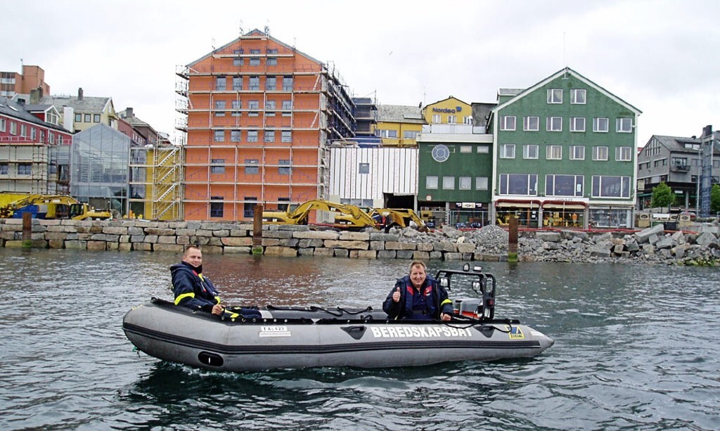 Her er første beredskapsbåten i Kristiansund utenom Redningsselskapet. Denne skulle opereres både av brannvesenet, politiet og ambulansepersonellet også fra kaia ved fergetillegget. På bildet er Trond Sæther og ved motor Ole Fr. Kanestrøm i 2003. Den nye Storkaia er under bygging. ( Arkiv BN)
